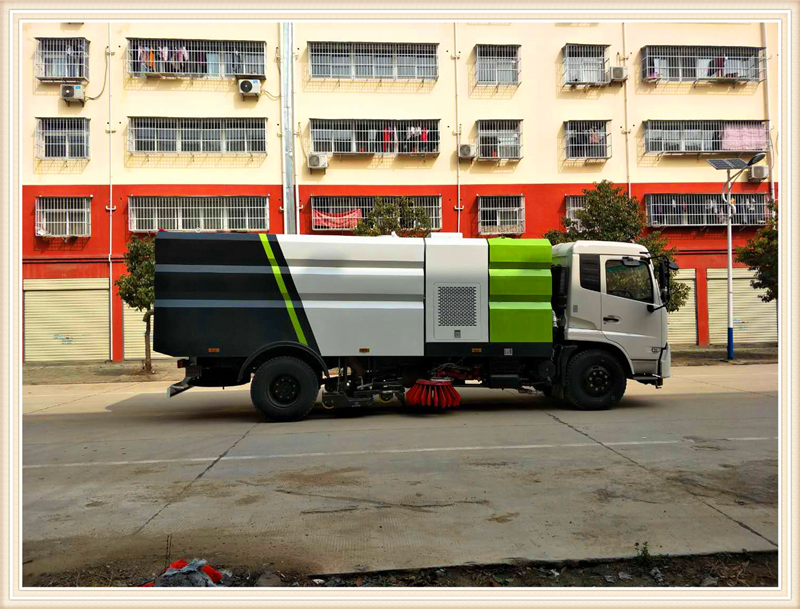 這款東風多利卡洗掃車采用大功率副發動機驅動液壓油泵和風機,將垃圾箱內空氣抽出形成負壓,前置兩盤刷高速旋轉收集垃圾,中置寬吸盤兩側的防撞壁障高壓噴桿沖洗路面,利用垃圾箱內的負壓及吸盤內置高壓噴頭沖洗動力,將垃圾吸入箱內。動力輸出及控制系統均采用氣動+電液控制。水箱及垃圾箱均采用不銹鋼材料加工成方形瓦棱結構,既美觀又耐用。