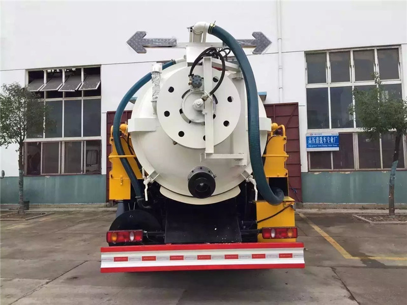 另外,該車污罐:Q235武鋼6MM厚碳鋼板,罐體容積污水罐9個立方,清水罐3.5立方,采用山東k15的水循環(huán)泵,采用215品孚高壓泵,19高壓管80米,兩根ND100的吸污管標配采用億豐大功率10噸真空泵,油水分離器,防溢閥,視糞管,配2根8米吸污管,罐體封頭一次壓鑄成型、罐體帶舉升,后蓋為液壓開啟,罐內(nèi)污物可通過后蓋直接傾倒。尾部一個150球閥排污口,帶箭頭指示燈,具有真空度高、噸位大 用途更的特點。