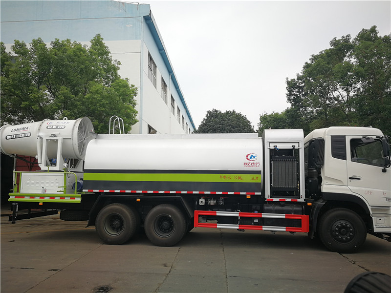 這款東風天錦抑塵車主要結構是在行走機構上加裝方型大容積水罐、高效遠程霧炮系統、大功率專用自吸自排水泵,中低壓沖洗灑水系統、綠化灑水高炮(可選裝自動灑水高炮,在罐體前端)等等而改裝組成 罐體容積大(方罐容積12立方),免征產品。副發動機為柴油120KW發電機組,11KW水泵,37KW風機發動機,鋁合金扇葉。無線操作(100米),及手動操作。霧化距離80米(靜風室內距離)實際射程:(霧化射程會受濕度、溫度、風速等各方面天氣因素的影響,另外天氣干燥地區一部分在空中被蒸發掉)。