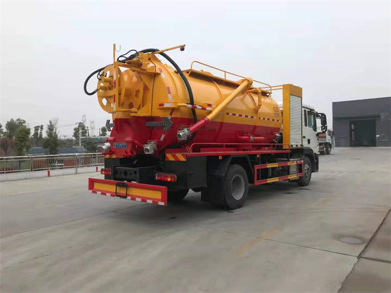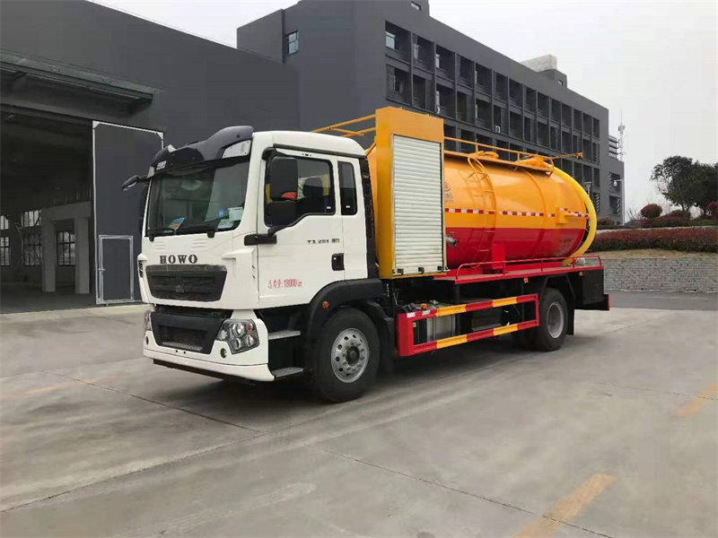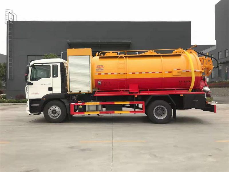 豪沃清洗吸污車選裝安裝SK-42水環泵配420馬力副發。卷盤裝后封頭180度旋轉,后封頭液壓打開。