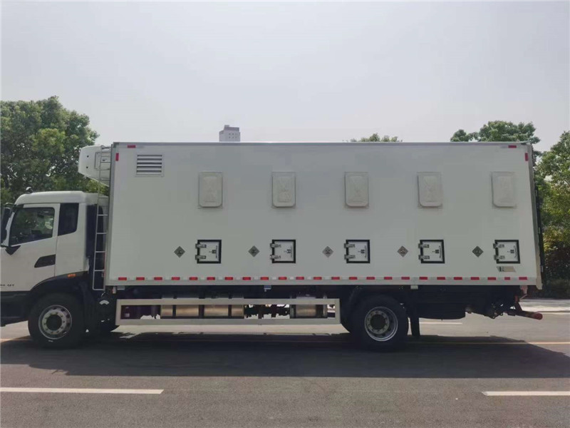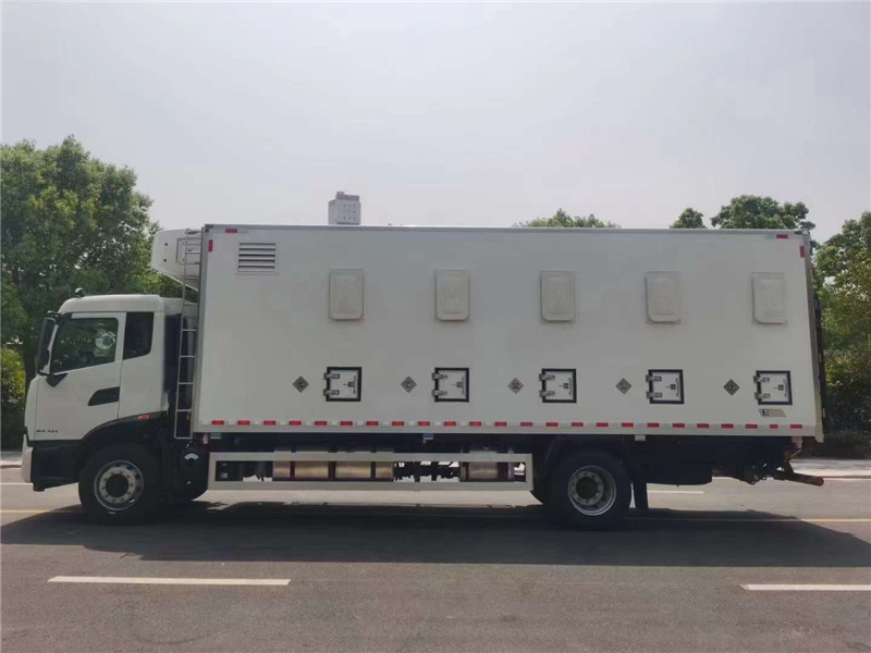車廂結(jié)構:車廂前部有1.2米混合倉,配有5個鼓風機,裝有散熱蒸發(fā)器, 加濕噴霧器,車廂后部為雞苗存放處,車廂頂部,左右兩邊配有出風通道, 車廂內(nèi)部配有八個環(huán)境溫度傳感器,和二氧化碳監(jiān)測器,配有240V發(fā)電機。