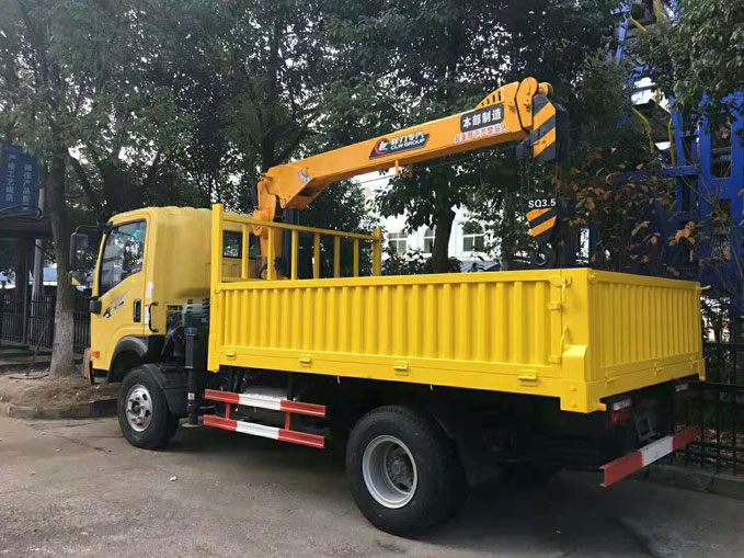 程力3.5噸重汽王牌隨車吊采用重汽 -- 王牌原廠底盤、錫柴130馬力發動機、國五排放標準,外形尺寸為5995×2350×3200、貨廂長度3.45米、軸距3360,可裝3.5噸吊機。重汽王牌3.5噸程力隨車吊整車型號為CDW5040JSQHA1R5,有燃油達標公告,該隨車吊。