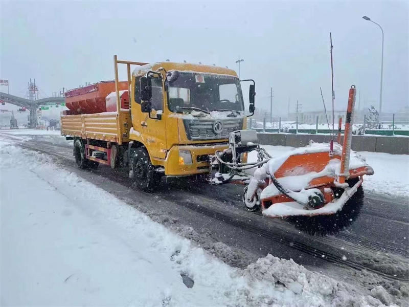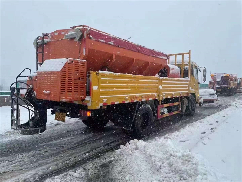 駕駛室前面雪鏟滾刷快速互速,貨箱上可配6-8立方融雪劑撒布機……