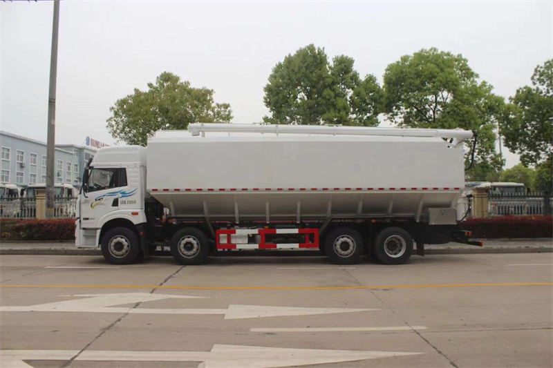 解放悍V前四后六國六散裝飼料運輸車, 悍V平地板高頂全浮駕駛室(四點空氣懸置),可選大柴320馬力(CA6DK1-32E6)或錫柴290馬力國六柴油發動機,一汽CA10TAX130M(半鋁殼),457升級沖焊橋(速比4.444),295/80R22.5-16層級.