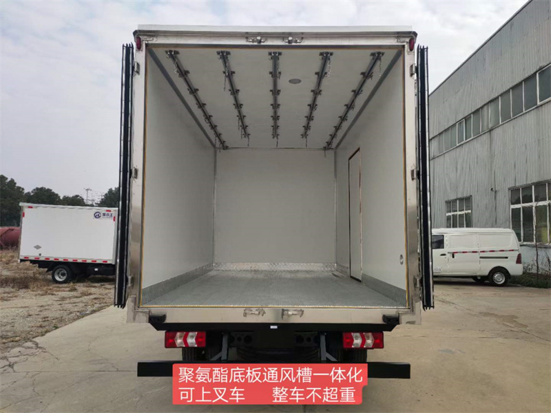國(guó)六江淮康鈴J6寬體肉鉤冷藏車,聚氨酯發(fā)泡底板和通風(fēng)槽一體成型。