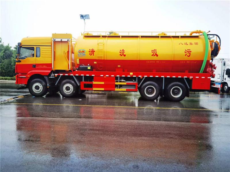 清洗吸污車上裝配置:罐體總容積約33立方,清水箱約10立方,其余為污水罐,加強大架,兩倉互通,采用8mm碳鋼制作,吸污部分,副發采用斷袖取力器配42水循環泵,8米吸污管,罐體兩側加寬平臺加護欄,后部開一個800mm液壓開啟排污口,一個150排污球閥,和一個100的排污球閥,100內抽球閥,偷排150球閥,后部左右各一個箭頭燈,配品浮350流量,配100米內徑25定制耐磨高壓管,卷盤液壓左右旋轉,配10公斤槍頭一個。整車顏色:黃/紅