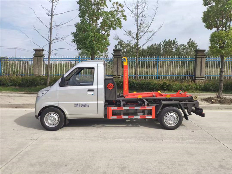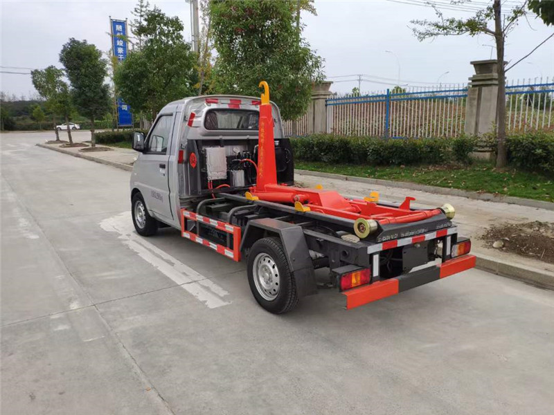 1-1.5噸鉤起能力,12兆帕系統壓力,12V控制電壓,20L液壓油箱容積,導軌寬度900MM,鉤箱時間45S,鉤心高度1000MM,鉤心到后滾輪距離1850MM,配套2.5-3立方垃圾箱