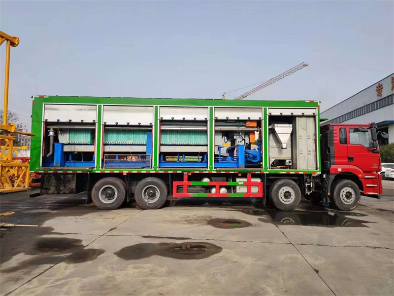 車箱頂部活動扣板便于板框壓濾機操作,注料泵37kw,前面2立方304不銹鋼拌藥箱雙攪拌,500升304不銹鋼絮凝槽,配電柜可外接電源。 抽污運行系統:11kw泥漿泵,1.1千瓦加水泵,1.5千瓦加藥泵,過濾出來的水可通過加水泵抽到拌藥箱、清水箱循環利用,吸污管4根,每根6米,每小時可壓泥餅4立方左右,泥餅含水量60%左右。泥漿處理車價格電詢或面議。